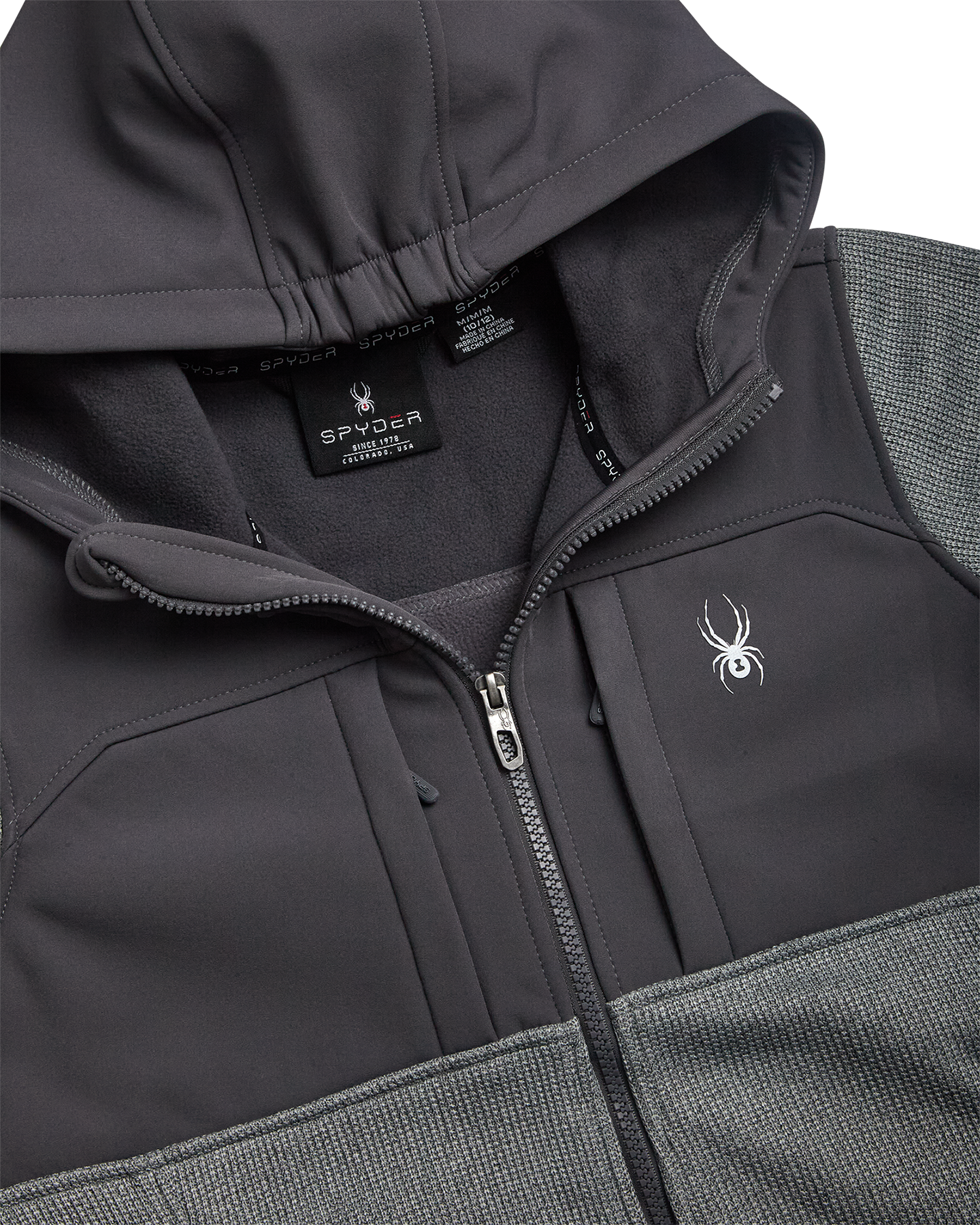 Built for warmth, comfort, and performance. The Core Sweater Fleece Softshell Jacket features a bonded textured sweater fleece shell with 3-layer softshell panels for extra durability and weather protection. A Vislon front zipper with Spyder pull and hidden zipper pockets keep it functional, while reflective Spyder logos and a flag label at the side seam complete the clean, modern look.