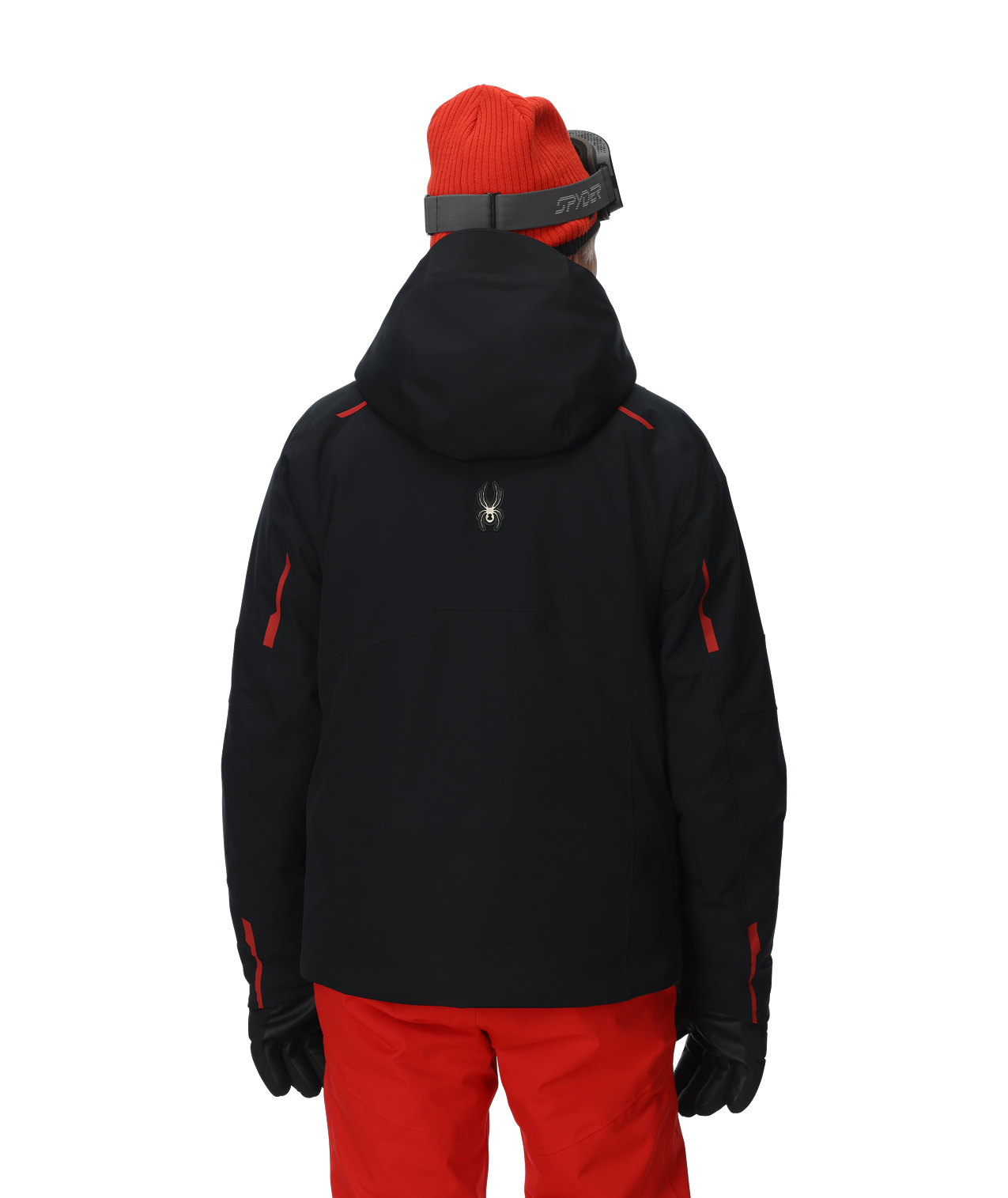 Black jacket with red accents and Spyder branding, featuring insulation and moisture-wicking text.