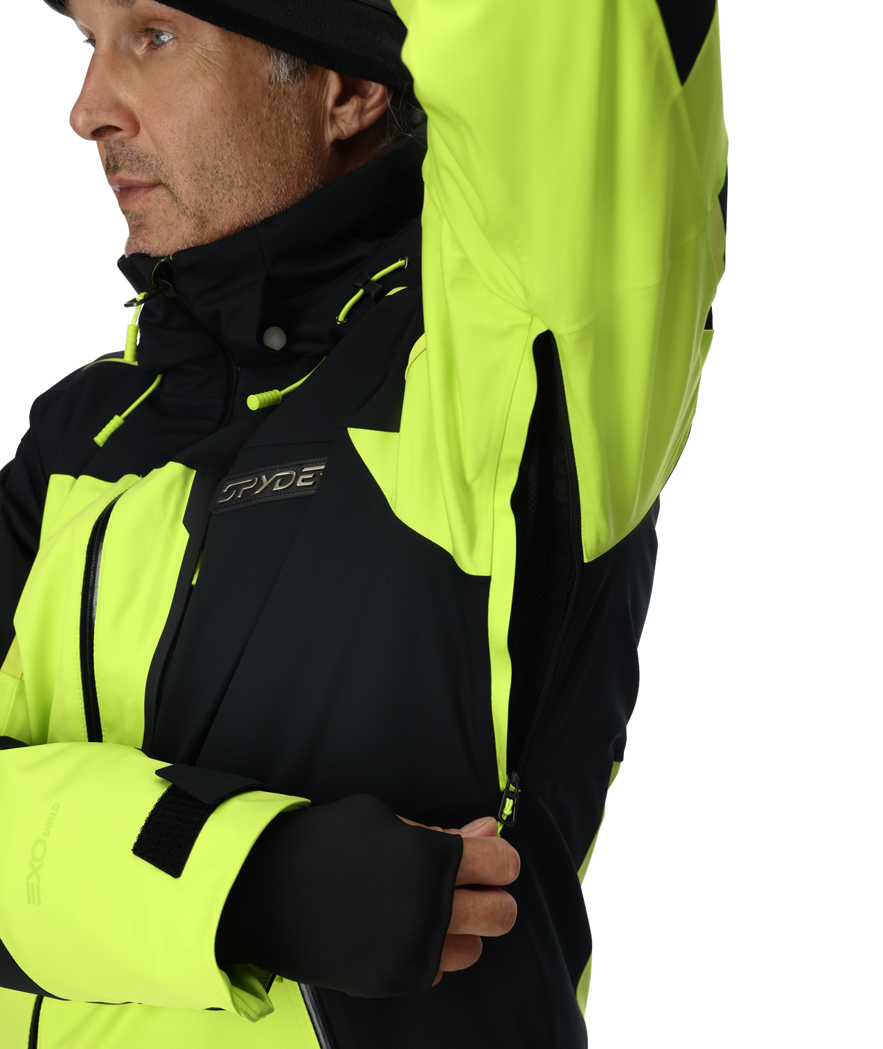 Person wearing a Spyder jacket with visible branding and features.