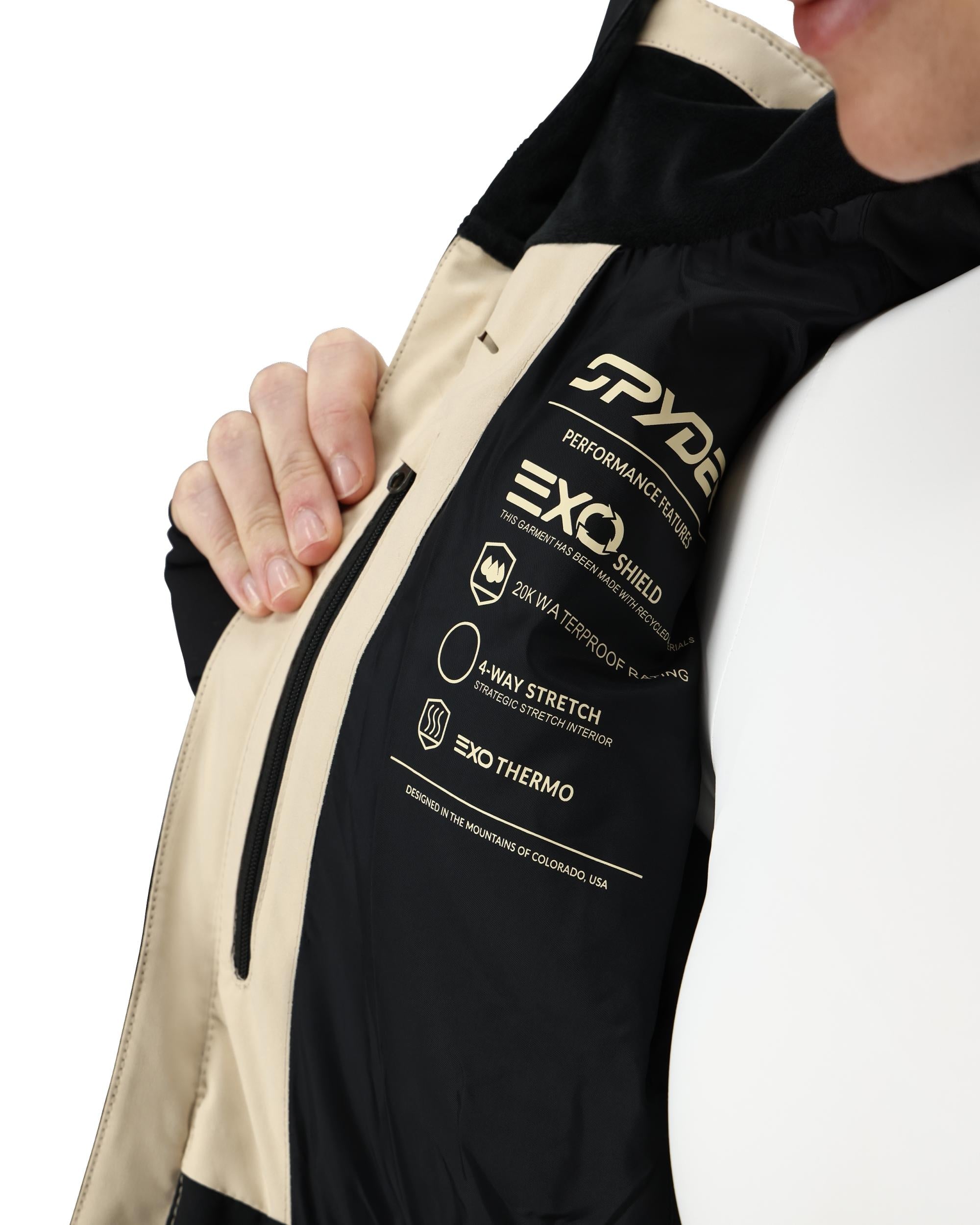 Close-up of a jacket with Spyde branding and feature text on a white background
