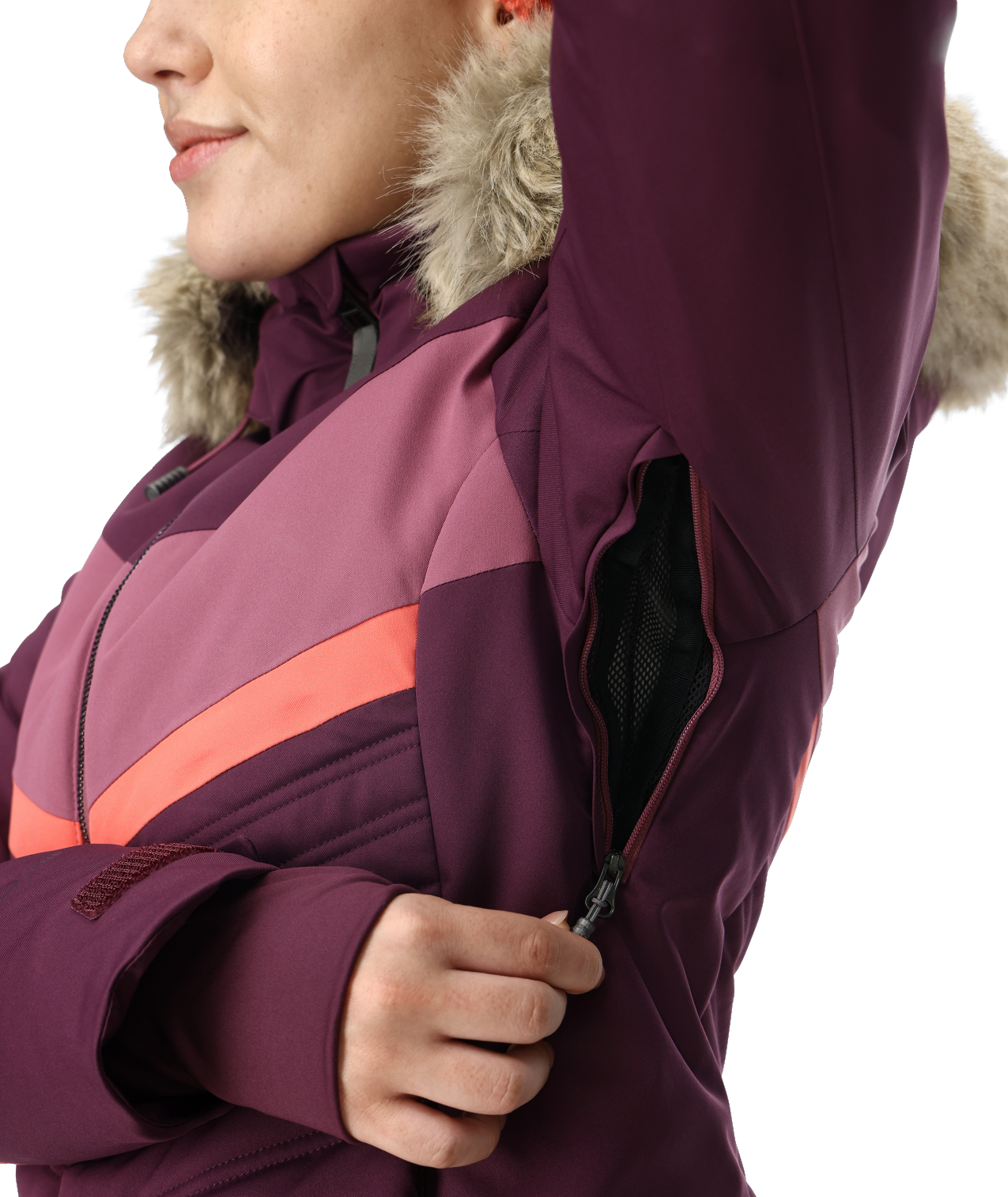 The Primrose jacket is ideal on or off the mountain. EXO SHIELD 30K/20K fabric, durable water repellent, and a removable powder skirt keep the elements at bay. It includes a removable hood with snap-off faux fur, underarm ventilation, interior pockets, and adjustable cuff tabs and hem. Targeted interior stretch panels move with you across the mountain. With 170 grams of PrimaLoft® Hi Loft Silver ECO® insulation, these features all work in harmony to meet you where you're at, whether you're skiing groomers on a bluebird day or taking on a heavy-duty powder day.