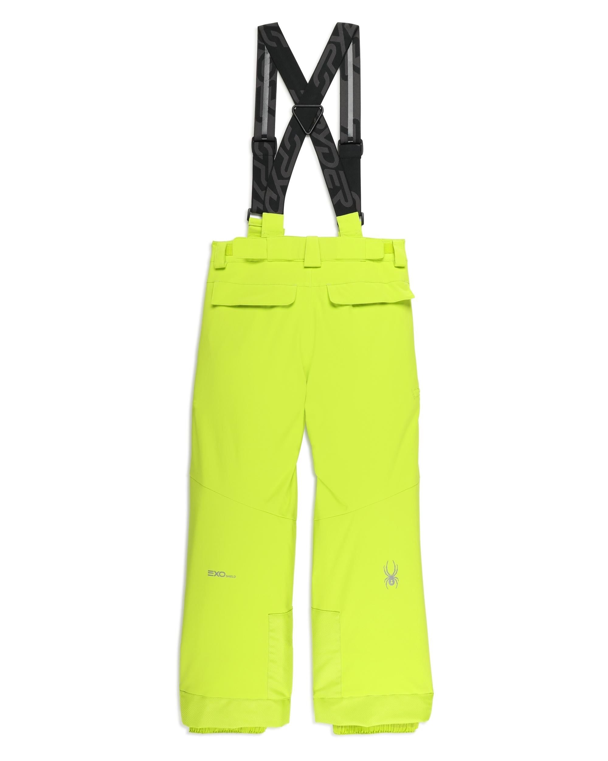 High-performing features and the full array of colors let you match the Propulsion pants with any Spyder jacket. The YKK® thigh pocket zipper, inner snow gaiters with gripper elastic and reinforced scuff cuffs and removable, adjustable suspenders help ensure staying warm and dry on the mountain or in the backyard on a snow day. EXO SHIELD 10K/10K recycled fabric and Sorona® insulation (60g) ensure you stay warm and dry on the mountain.