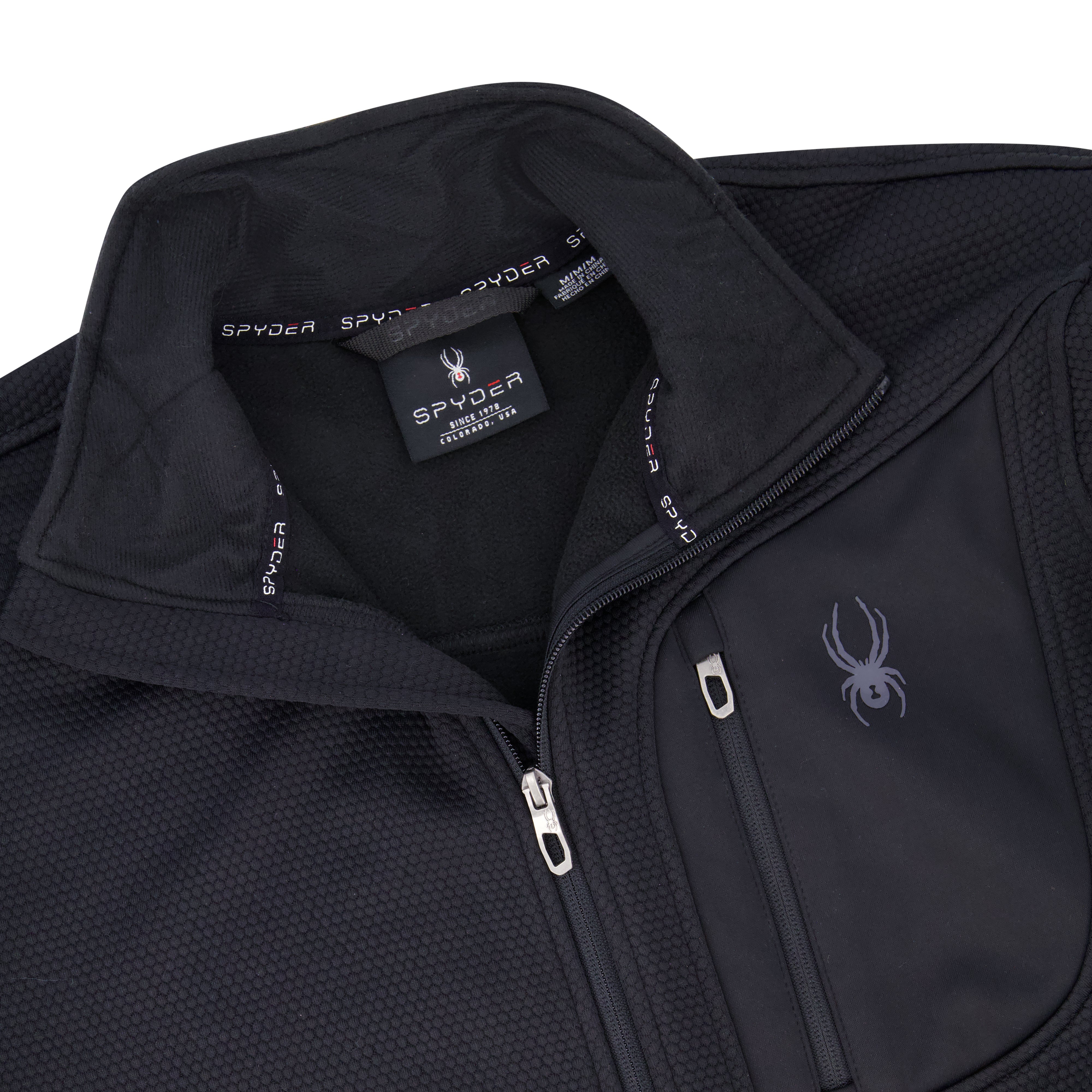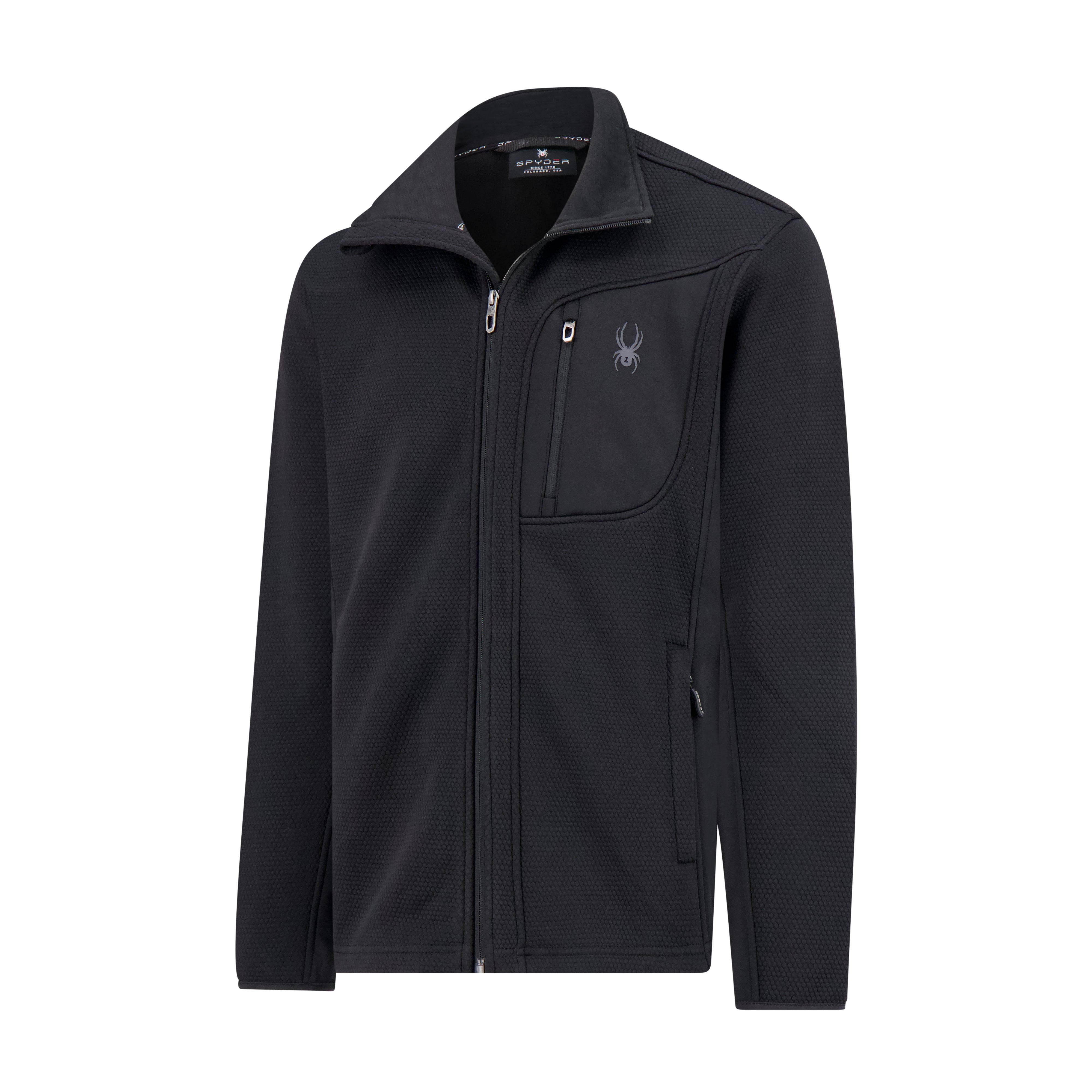 The Encore Fleece with Bonded Jersey Jacket combines a bonded hexagon fleece shell with bonded jersey side panels and a chest patch pocket for added structure and durability. It features reversed coil zippers with Spyder metal pulls, hidden zip hand pockets with Spyder peanut pullers, and brushed tricot on the inner collar for added comfort. Finished with a Spyder 3D logo on the chest, Spyder embroidery on the back, and a Spyder flag label at the side seam.
