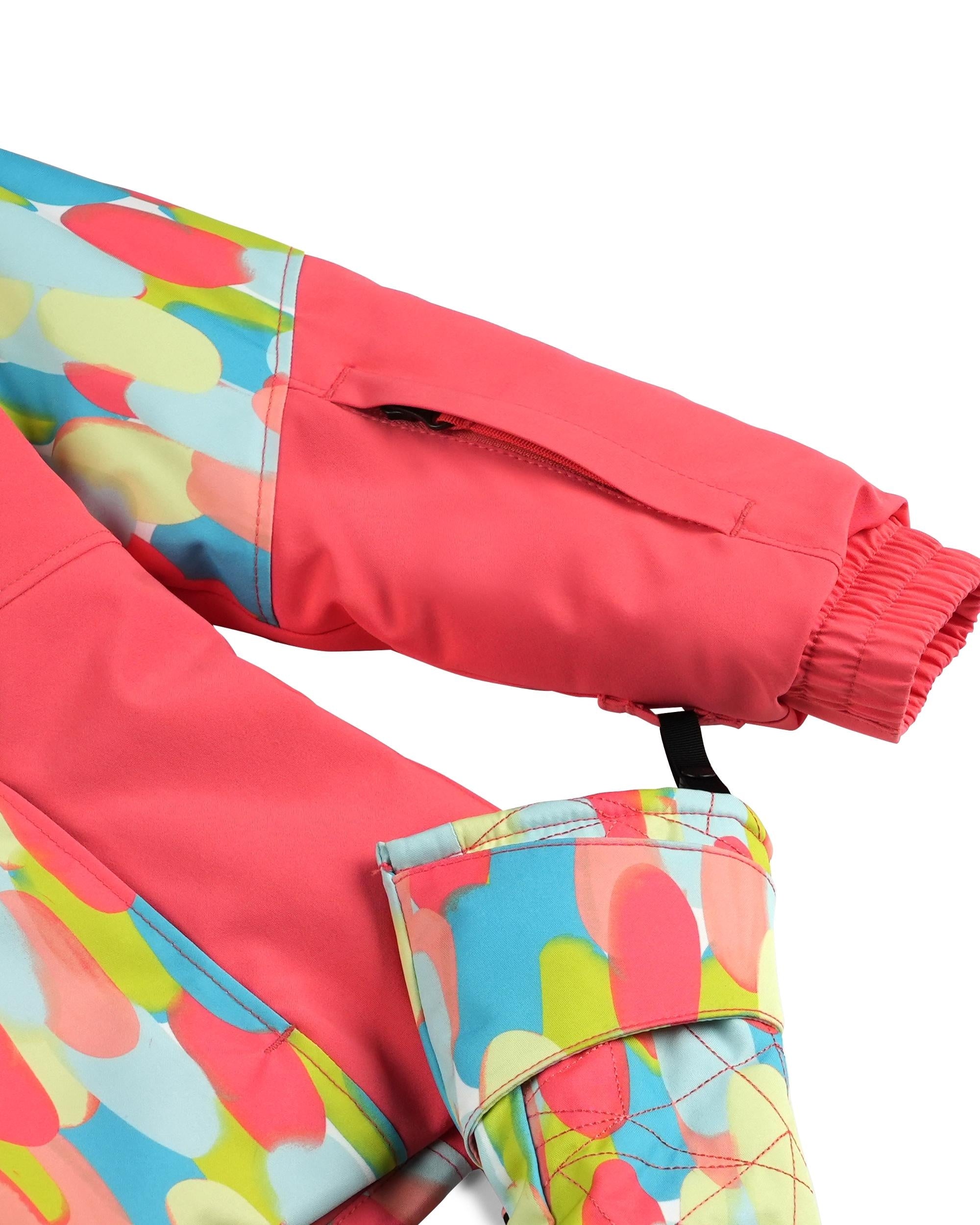 Colorful ski pants with a pink base and multicolored pattern on a white background