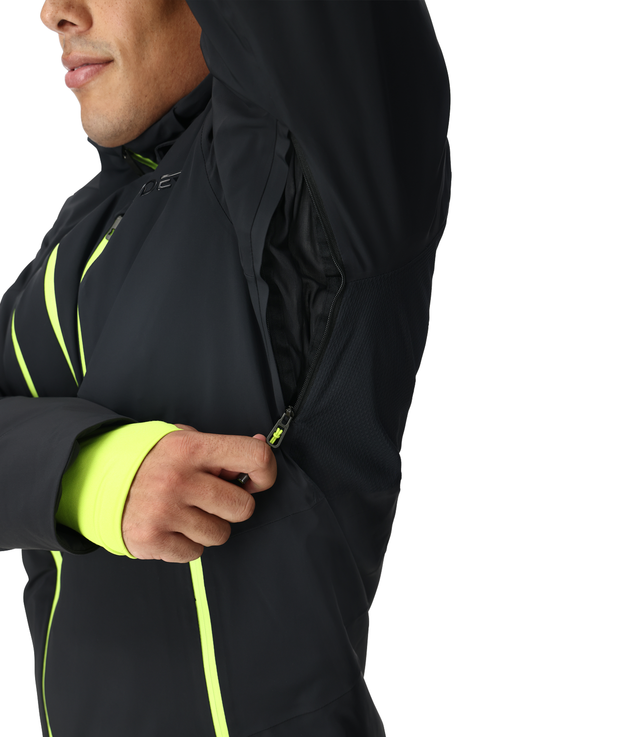 The brand-new Alyeska jacket is packed with specialty features to help maximize your time on the mountain. The 4-way stretch outer, strategically placed 2-way high stretch panels, and full stretch engineered interior allow you to easily twist and turn. At the same time, the EXO SHIELD 30K laminate, Durable Water Repellent coating, RECCO® Avalanche Rescue System, removable powder skirt, and fully sealed seams help keep you dry through your powder days. The PrimaLoft® Silver ECO insulation (60 grams) and underarm ventilation system keep you at just the right temperature, and you'll have storage for your on-mountain essentials with chest and hand pockets, a data card pocket, and two different interior pockets.