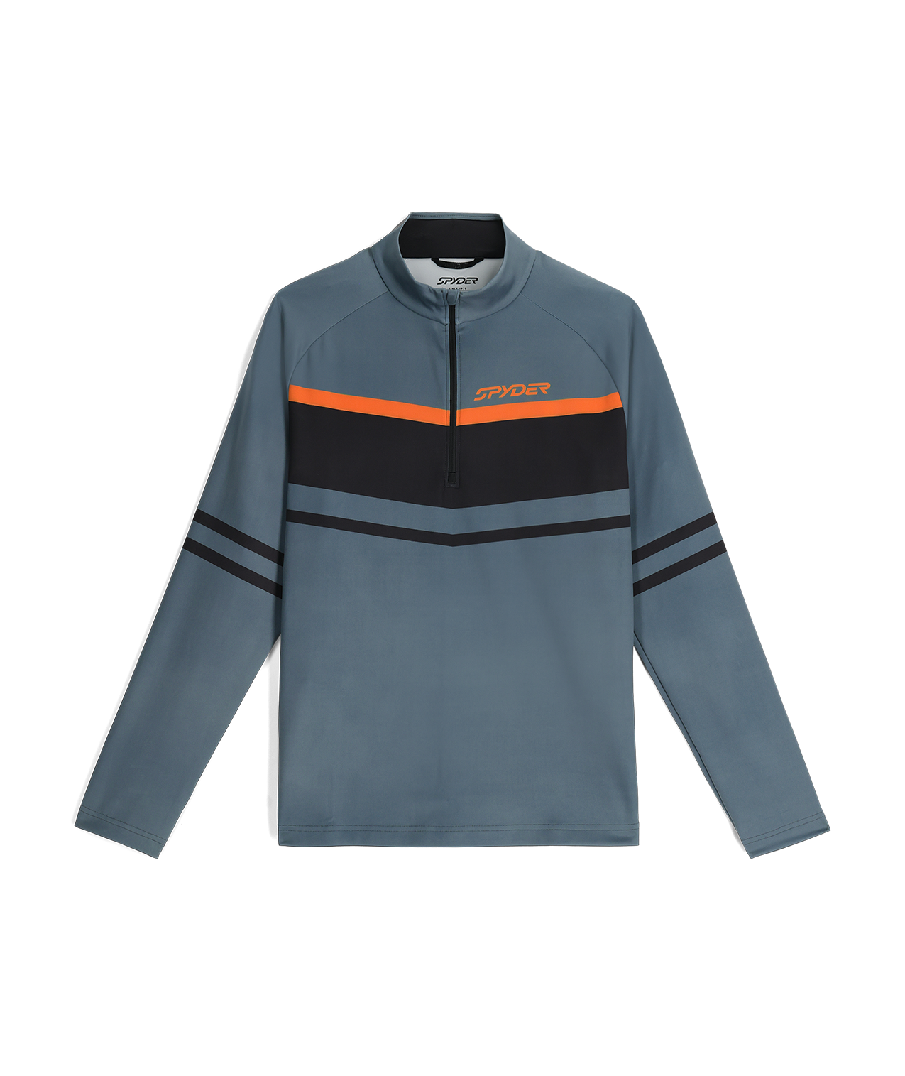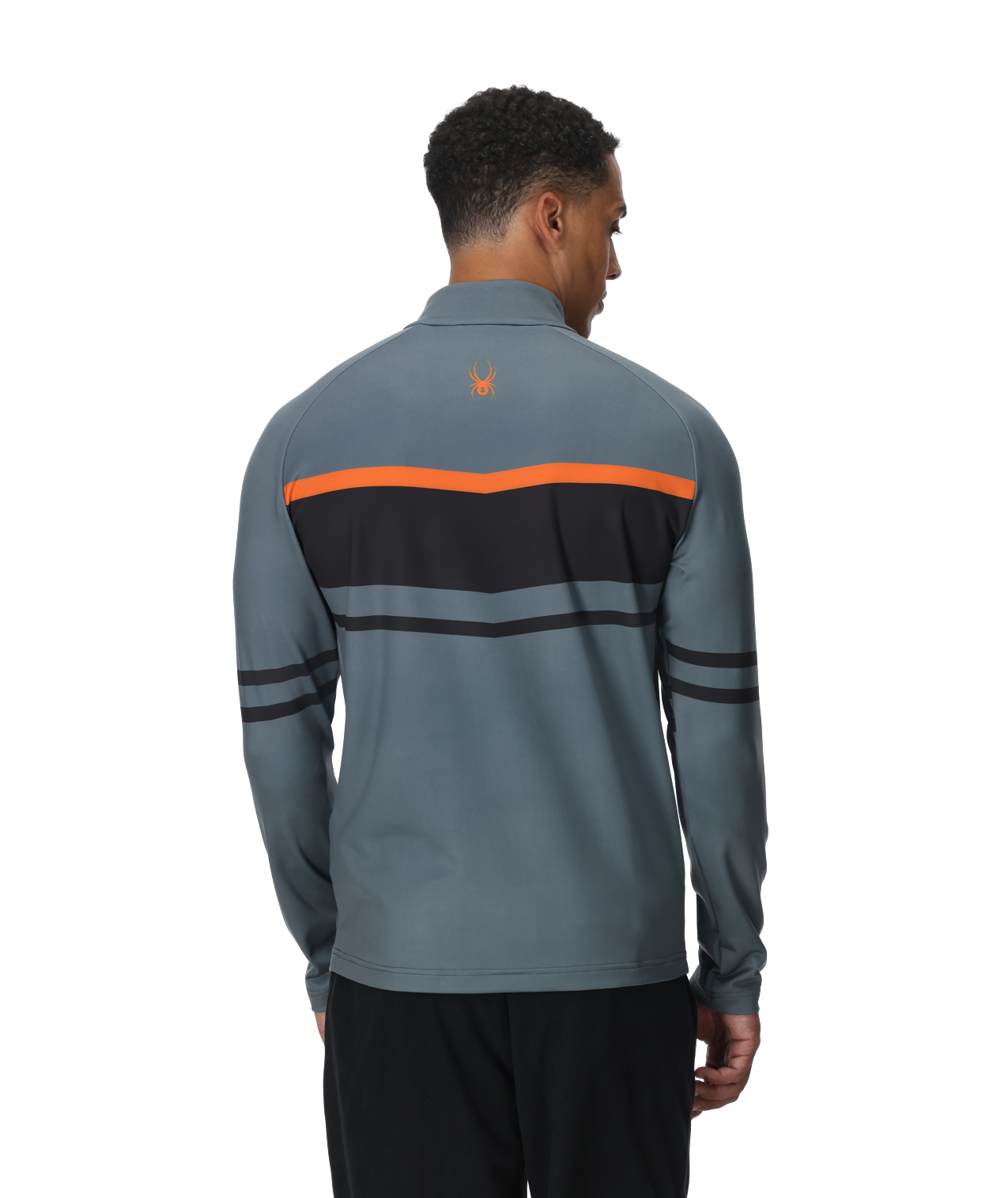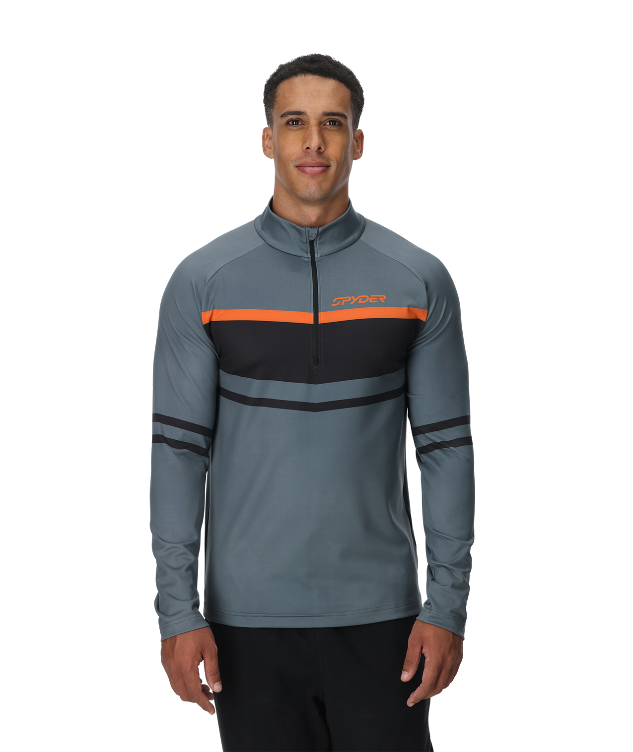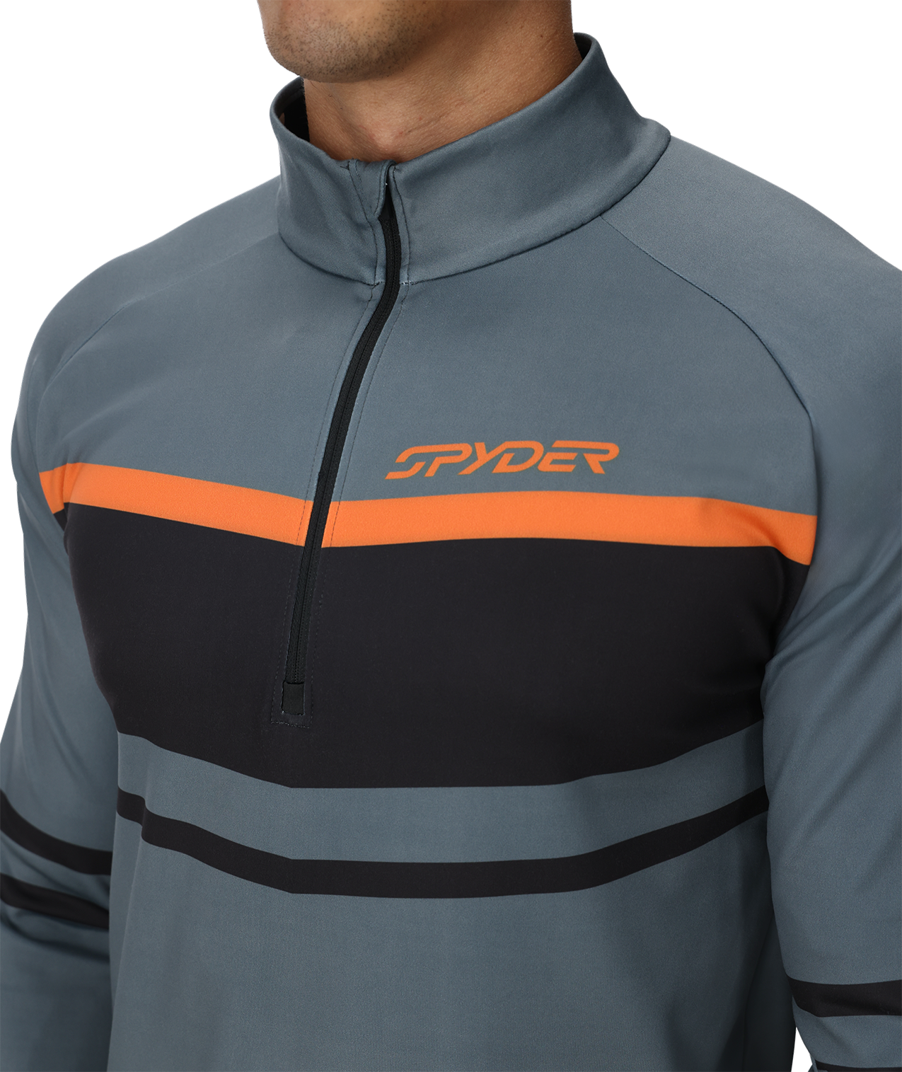 Gray and black half-zip pullover with orange accents and Spyder logo on a white background