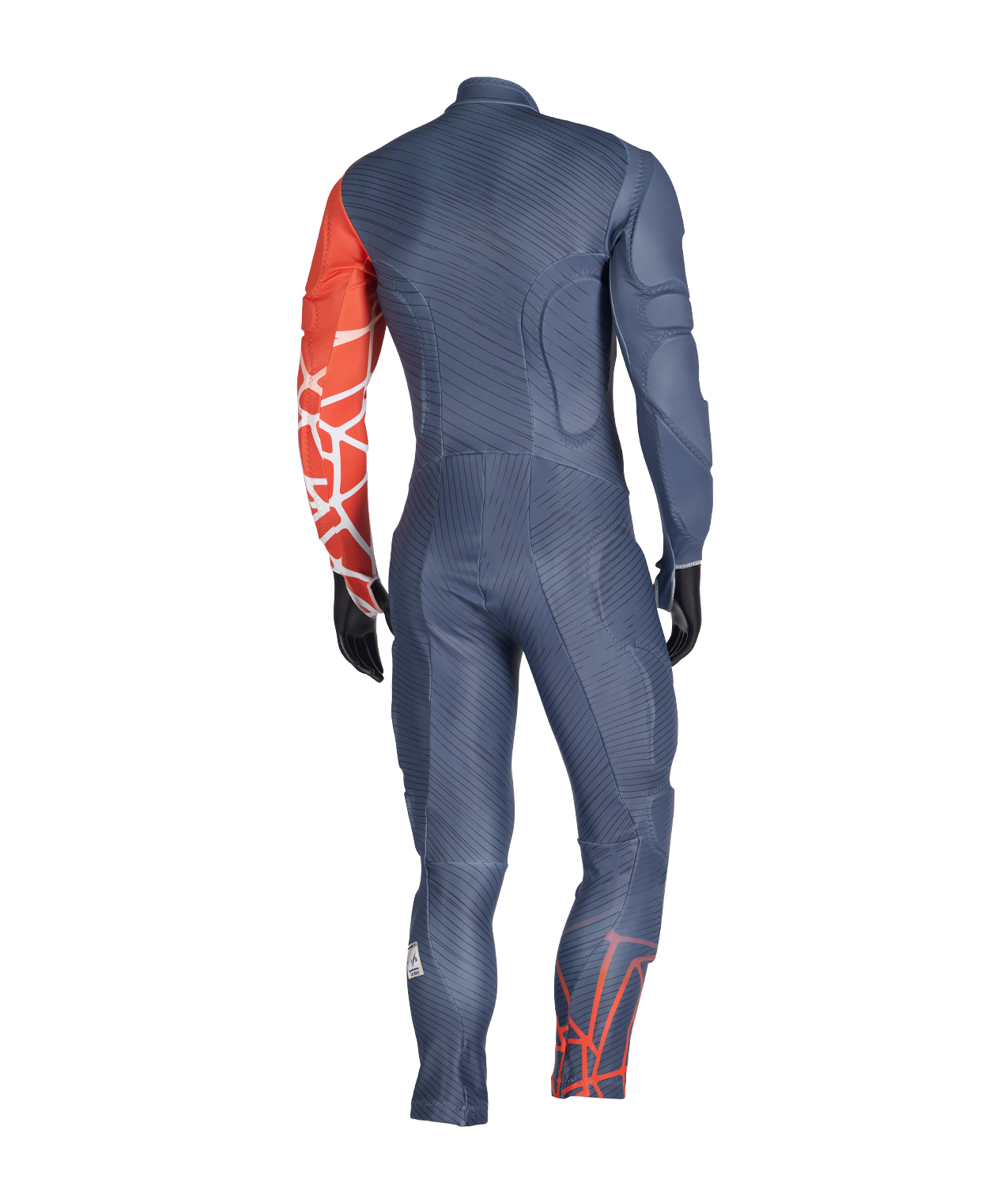Race suit with blue and orange design on a white background
