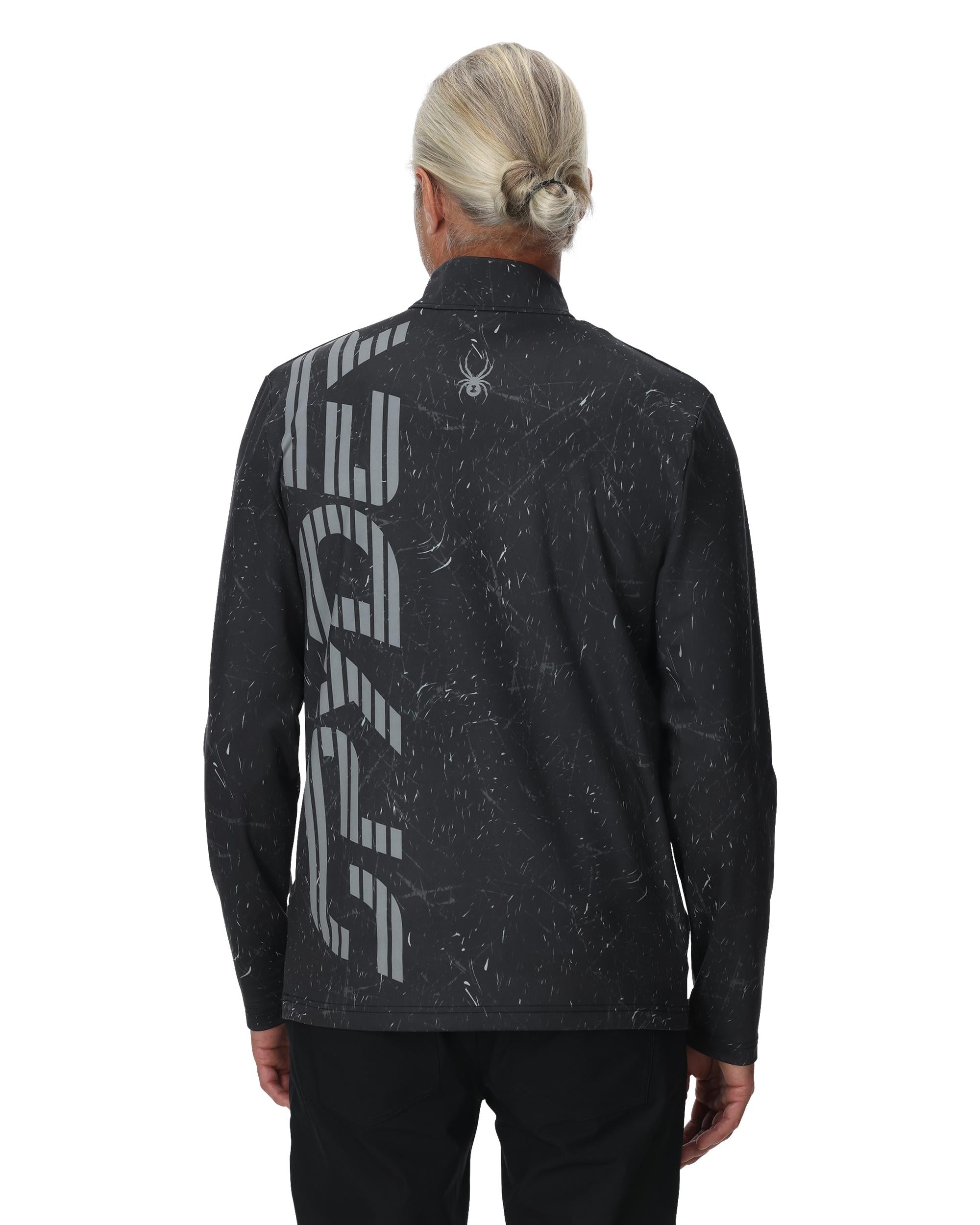 Man wearing a black long-sleeve athletic shirt with a brand logo on a white background
