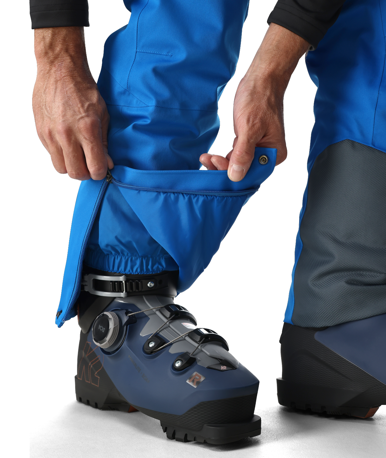 Person wearing blue ski pants with a black waistband and a visible brand logo.