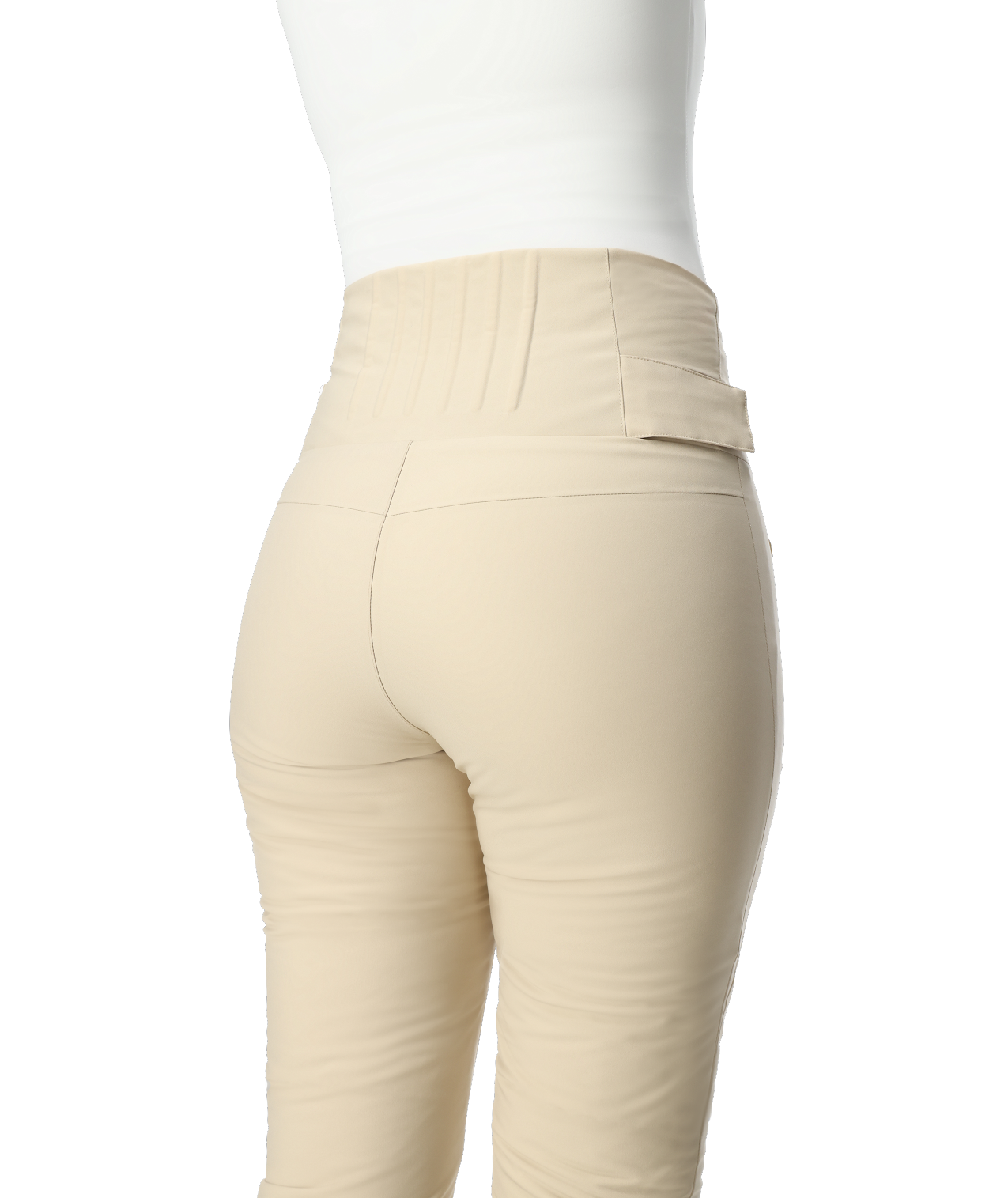 Person wearing beige pants with a white shirt, adjusting a beige patch on the waistband.